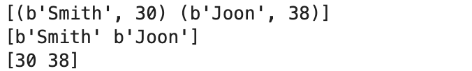 arr = np.array([('Smith',30),('Joon',38)], dtype = dt)