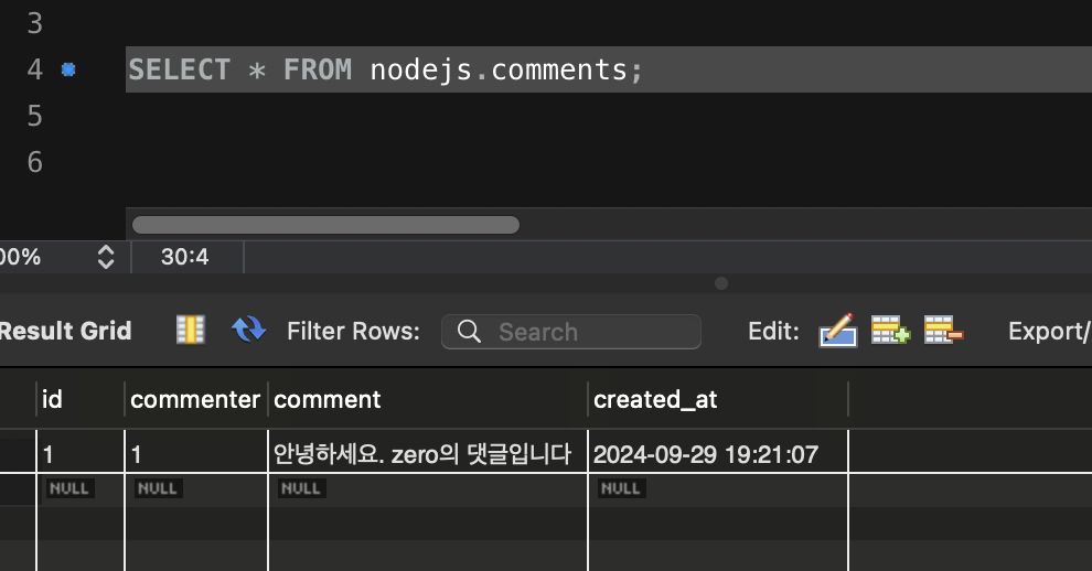 INSERT INTO nodejs.comments(commenter, comment) VALUES (1,'안녕하세요. zero의 댓글입니다');